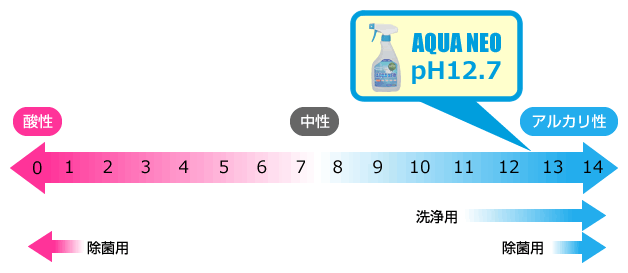 一般的に洗浄効果があると言われるのが「pH10以上」で、アクアネオのpH12.7には高い洗浄効果が期待できるでしょう。さらに、pH12.5以上になると、洗浄効果だけでなく「除菌効果」も現れるため、アクアネオは洗浄&除菌のダブル効果が期待できる訳です。